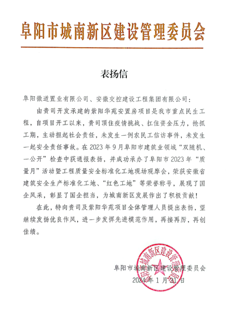 祝賀我公司阜陽紫陽華苑項(xiàng)目獲得當(dāng)?shù)卣谋頁P(yáng)和嘉獎(jiǎng)