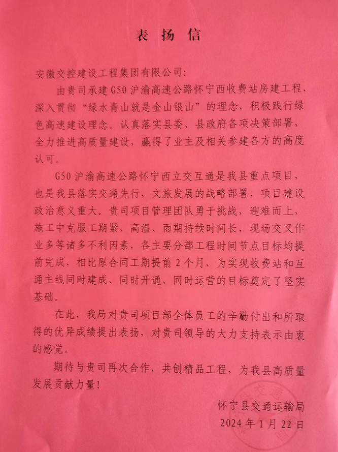 祝賀我公司懷寧西收費(fèi)站項(xiàng)目獲得甲方的表揚(yáng)和嘉獎(jiǎng)