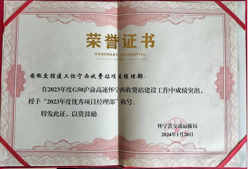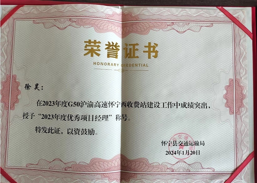 祝賀我公司懷寧西收費(fèi)站項(xiàng)目獲得優(yōu)秀項(xiàng)目經(jīng)理榮譽(yù)